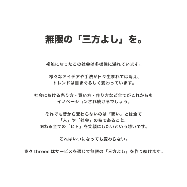 我々threesはサービスを通じて無限の「三方よし」を作り続けます。
